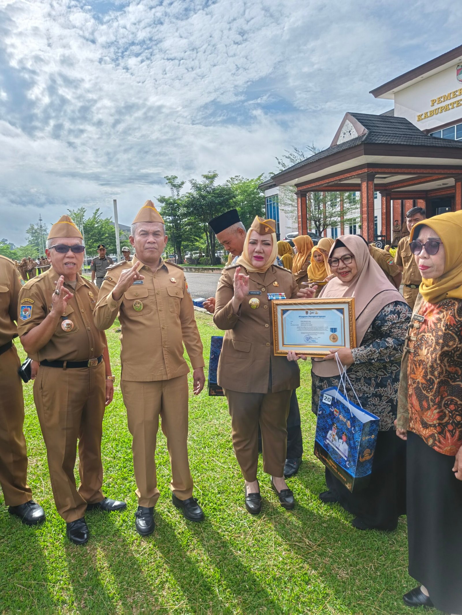 Ke semua ASN yang memasuki purna tugas menerima Piagam penghargaan dari Bupati Musi Rawas, Hj Ratna Machmud.