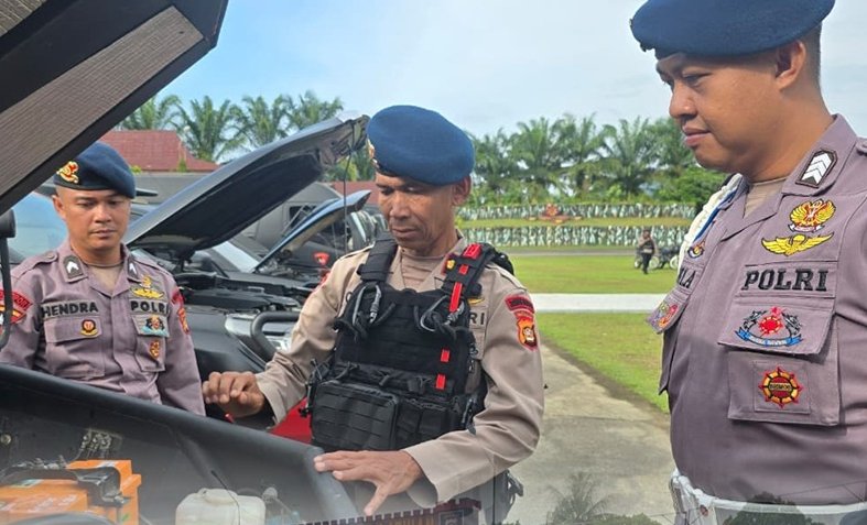 Tim teknis melakukan pemeriksaan pada sejumlah komponen penting, di antaranya kondisi fisik kendaraan, ban, aki, oli mesin, sistem kelistrikan, lampu rotator, sirene, serta perlengkapan pendukung lainnya guna memastikan seluruh kendaraan dalam kondisi siap operasional.