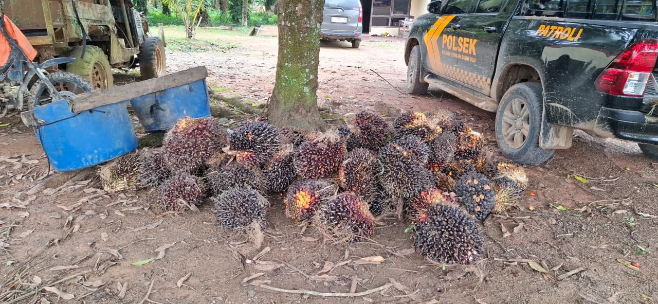 “Petugas mengamankan barang bukti berupa 55 janjang buah kelapa sawit dengan berat sekitar 750 kilogram atau senilai kurang lebih Rp2.362.500, dua buah dodos, satu keranjang plastik warna biru, serta satu unit sepeda motor jenis Supra Pit yang digunakan pelaku,” jelasnya.