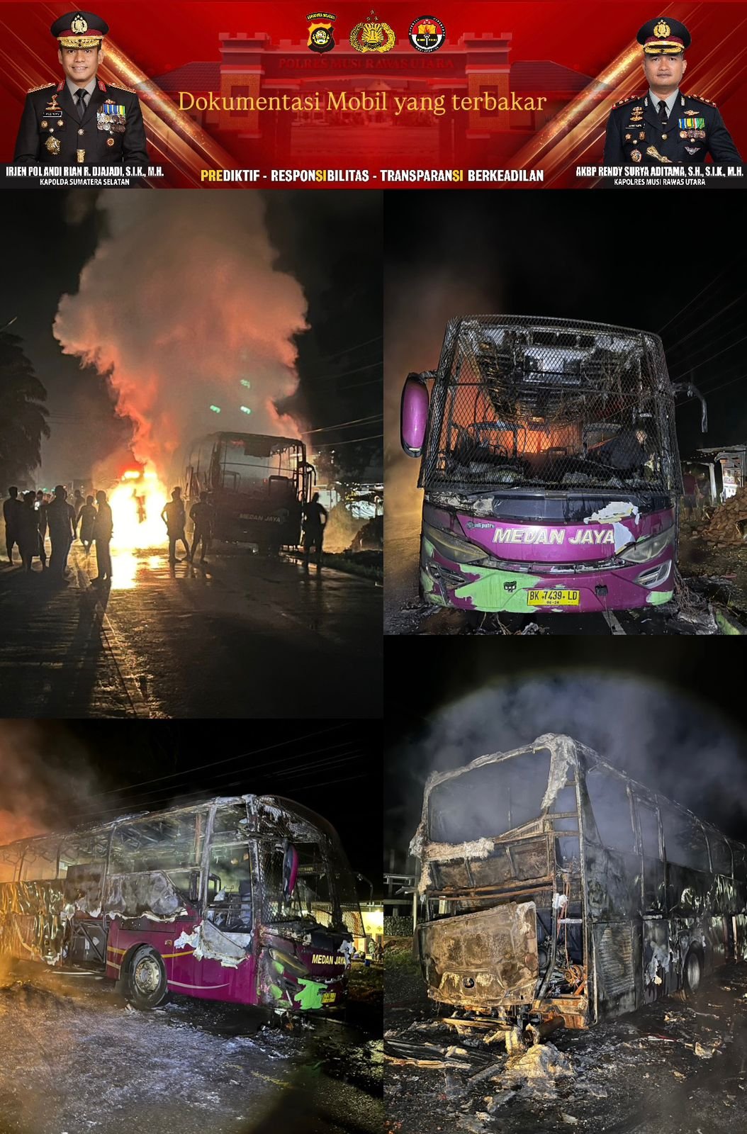 unit bis Medan Jaya BK 7439 LD tujuan dari Cililitan Jakarta Timur menuju Kota Medan Prov Sumatera Utara terbakar.