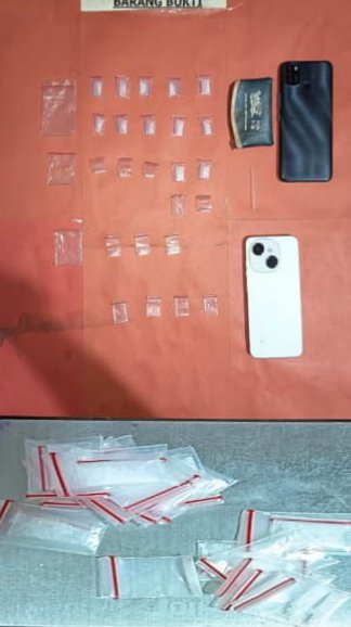 Barang bukti yang diamankan meliputi 19 paket sabu terbungkus plastik klip bening dengan berat bruto 5,18 gram, lima plastik klip kosong, satu sekop plastik, satu dompet kecil warna biru yang diduga menyimpan hasil transaksi, serta dua unit telepon genggam masing-masing merek Tecno Spark Go dan Infinix Smart 6.