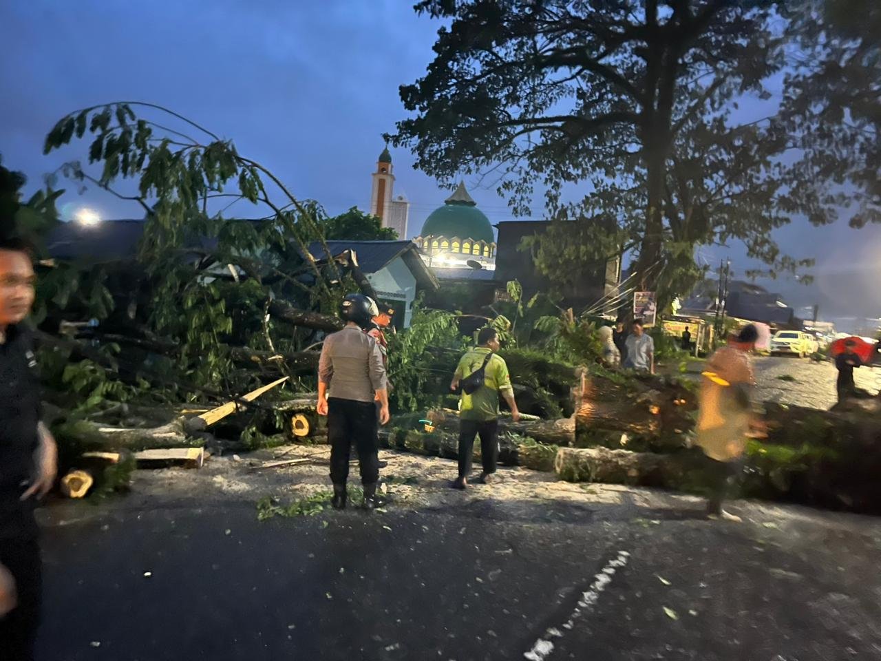 Warga yang berada di lokasi pun tak tinggal diam. Dengan semangat kekeluargaan, mereka membantu mengangkat ranting-ranting pohon ke tepian jalan agar akses jalan bisa segera terbuka kembali.