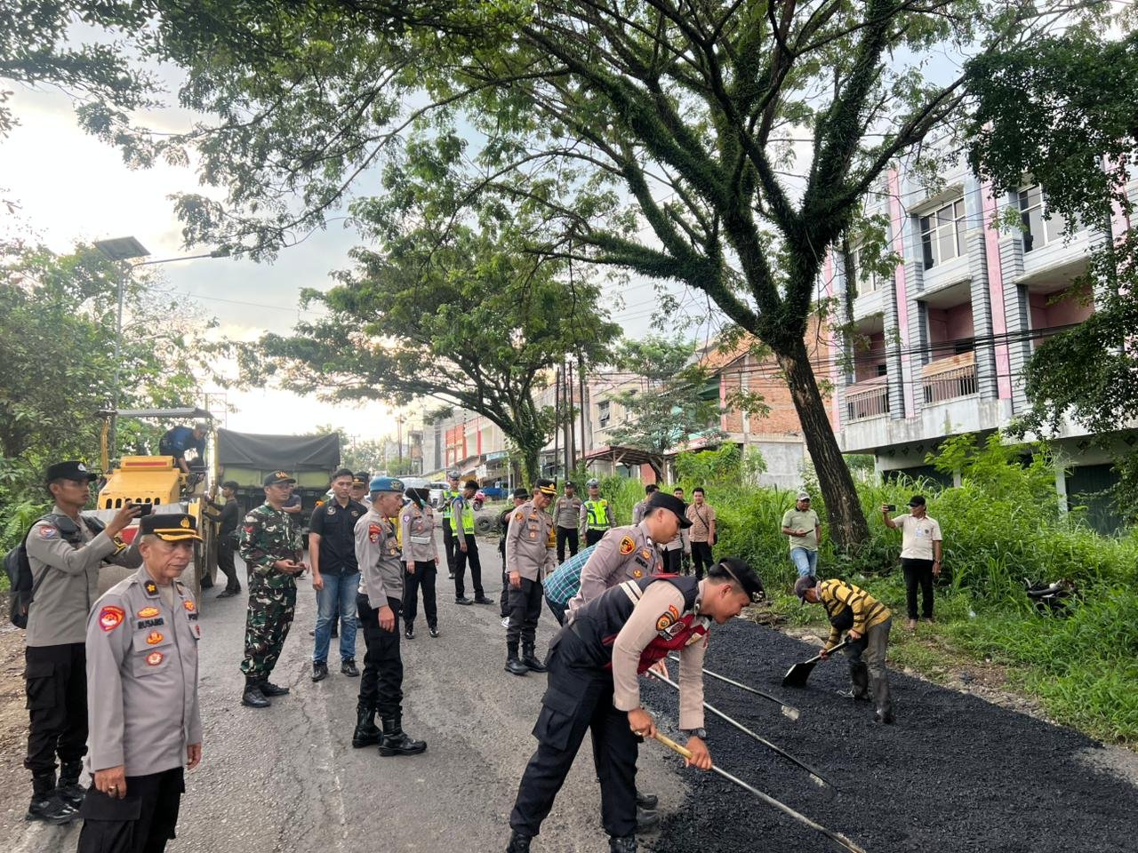 Baturaja,Sumselnetwork.com— Polres Ogan Komering Ulu bersama instansi lintas sektor melakukan penambalan jalan berlubang dan kegiatan bersih lingkungan di Jalan Ganesya Terminal Batu Kuning, Kecamatan Baturaja Barat, Jumat (13/3/2026).