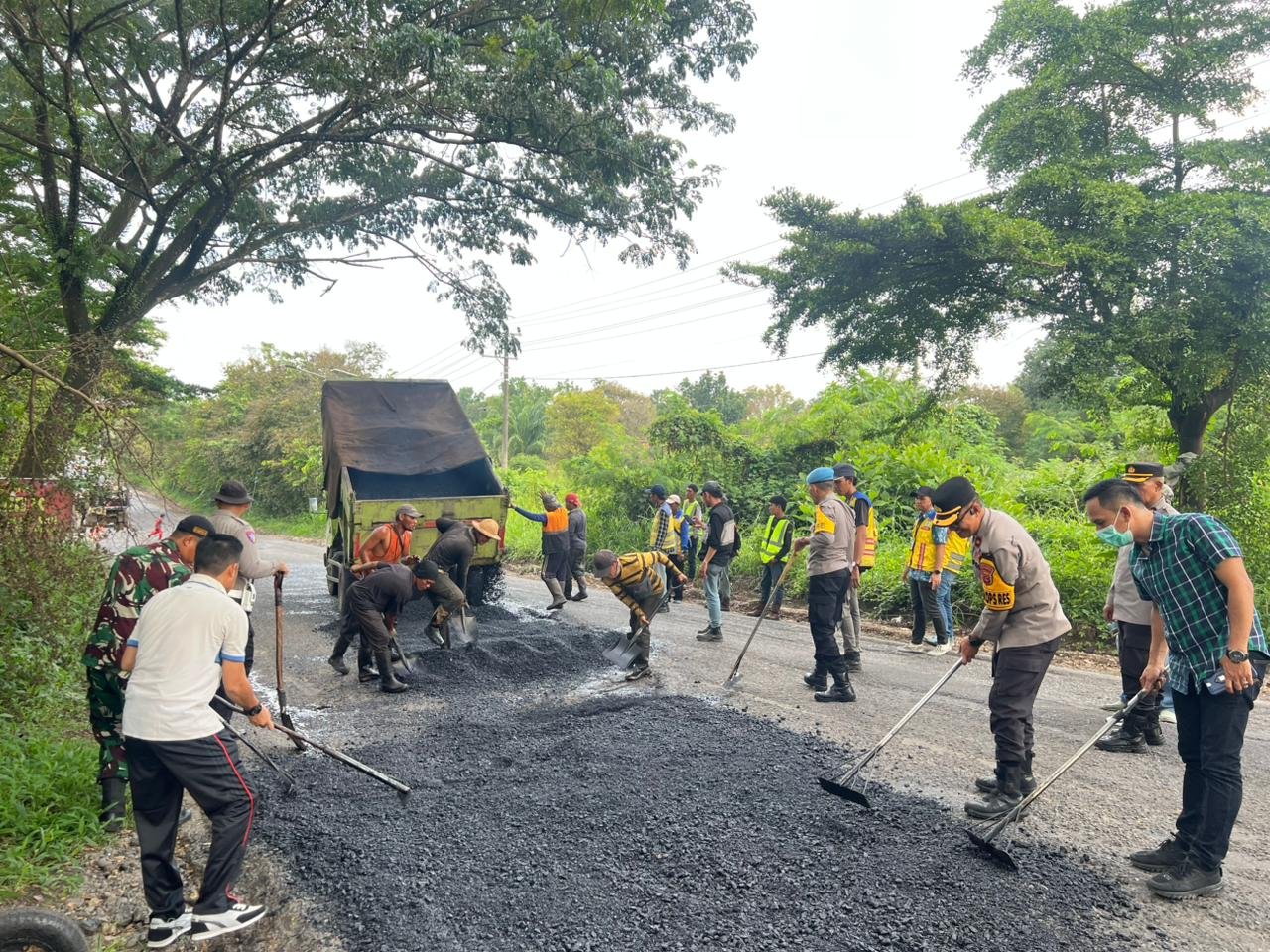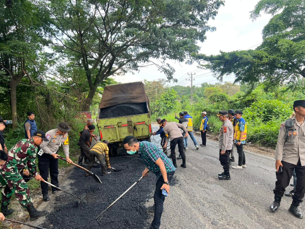 Selain memperbaiki jalan, seluruh peserta juga melakukan kegiatan bersih-bersih di sepanjang jalur lintas Sumatera di kawasan tersebut.