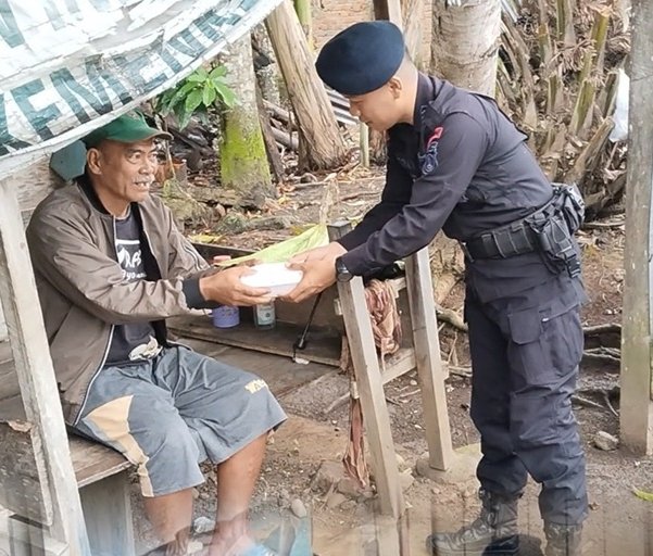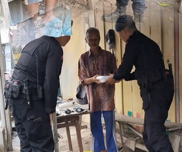 Dalam kegiatan tersebut, personel Brimob menyalurkan paket makanan berupa nasi kotak dan air mineral kepada masyarakat yang membutuhkan.