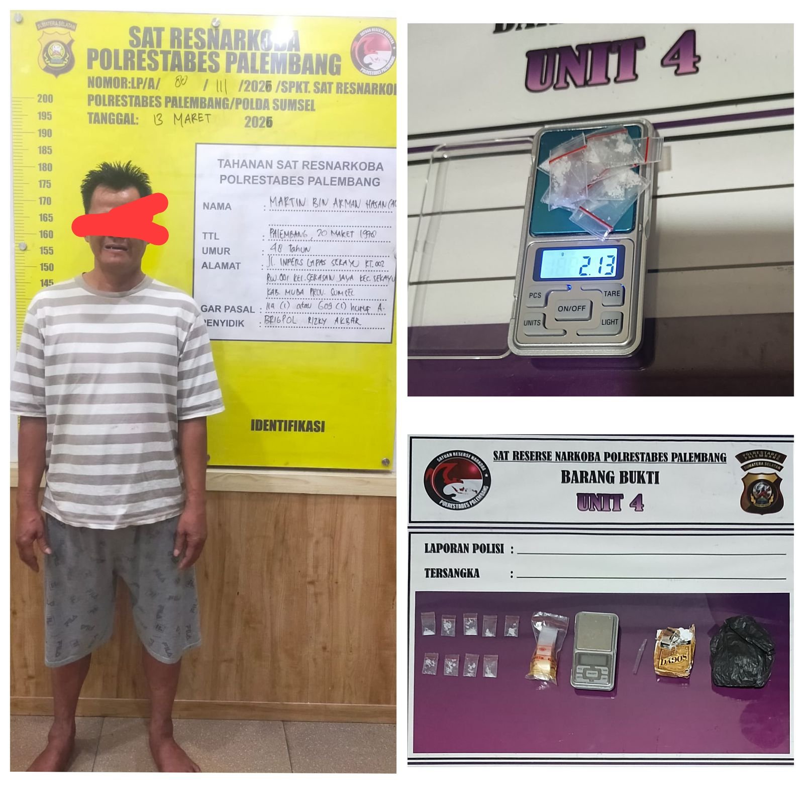 Unit IV Satuan Reserse Narkoba Polrestabes Palembang mengamankan tersangka M (48) di sebuah rumah di Jalan Pasundan, Lorong Slamet, Kelurahan Kalidoni, Jumat (13/3/2026) sekitar pukul 15.00 WIB.
