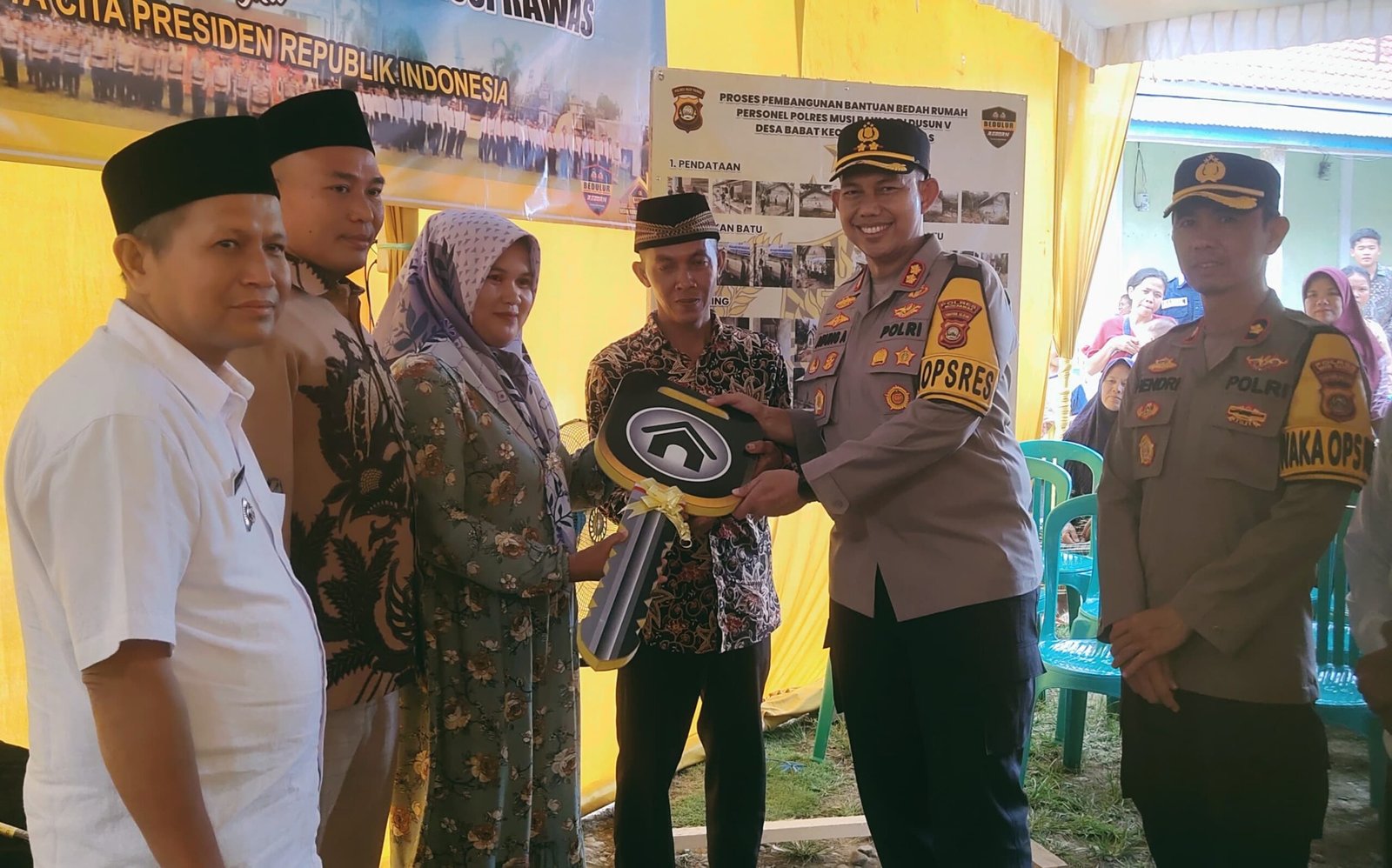 Wajah Hermansyah dan istrinya, Dina, warga Desa Babat, Kecamatan STL Ulu Terawas, Kabupaten Musi Rawas, terlihat tersenyum bahagia saat menerima kunci rumah hasil program bedah rumah dari Polres Musi Rawas.