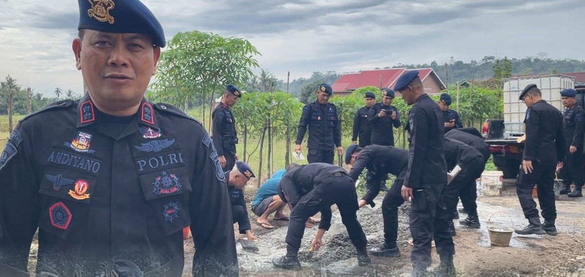 Perbaikan jalan rusak tersebut dipimpin langsung oleh Komandan Batalyon B Pelopor, AKBP Andiyano, S.K.M., M.H, Sabtu (28/2/2026).