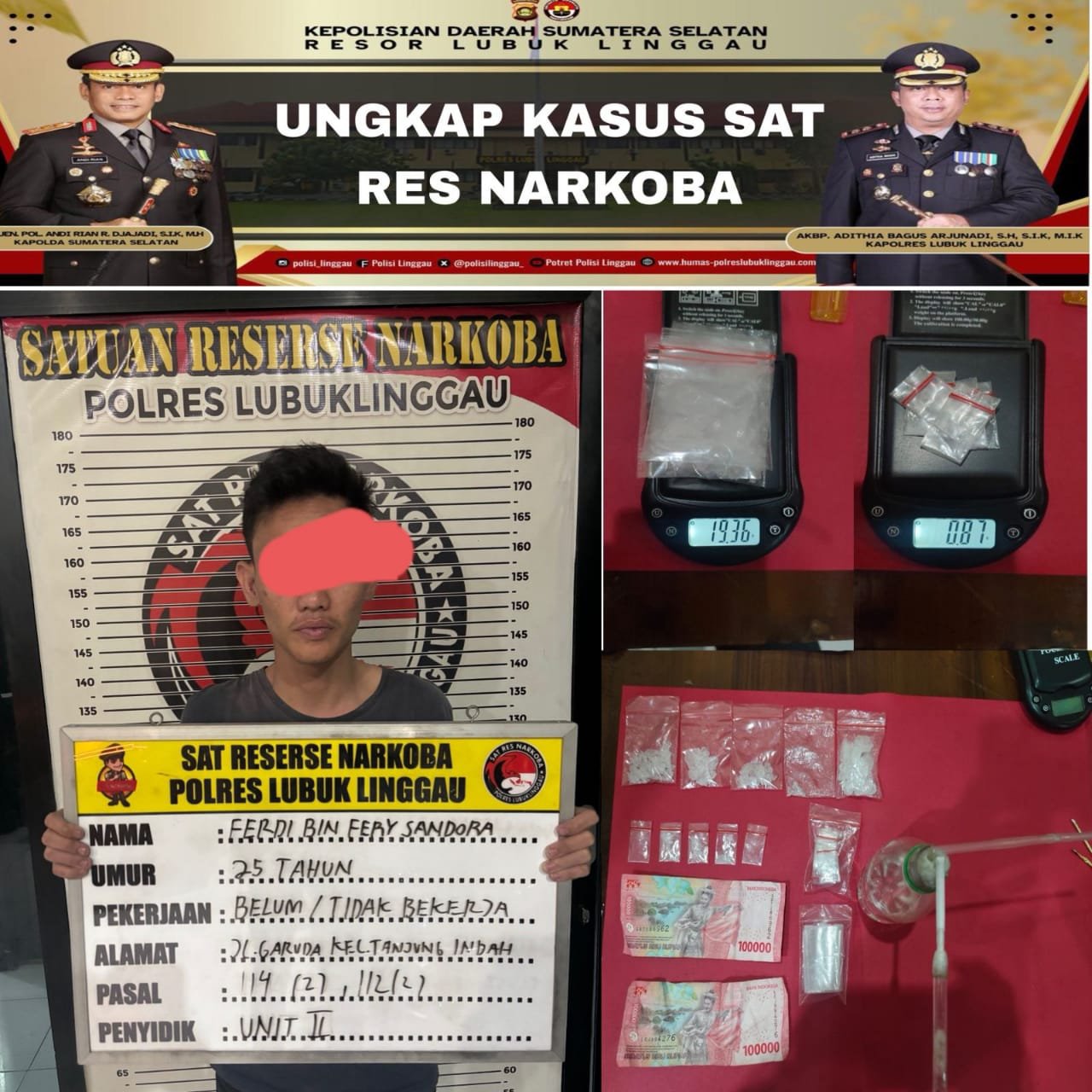 “Benar. Terduga pengedar narkotika jenis shabu berhasil ditangkap jajaran Sat Res Narkoba Polres Lubuklinggau,” kata Kapolres Lubuklinggau, AKBP Adithya Bagus Arjunadi, SH.S.ik.MH melalui Kasat Narkoba, AKP M Romi, SH.MH.