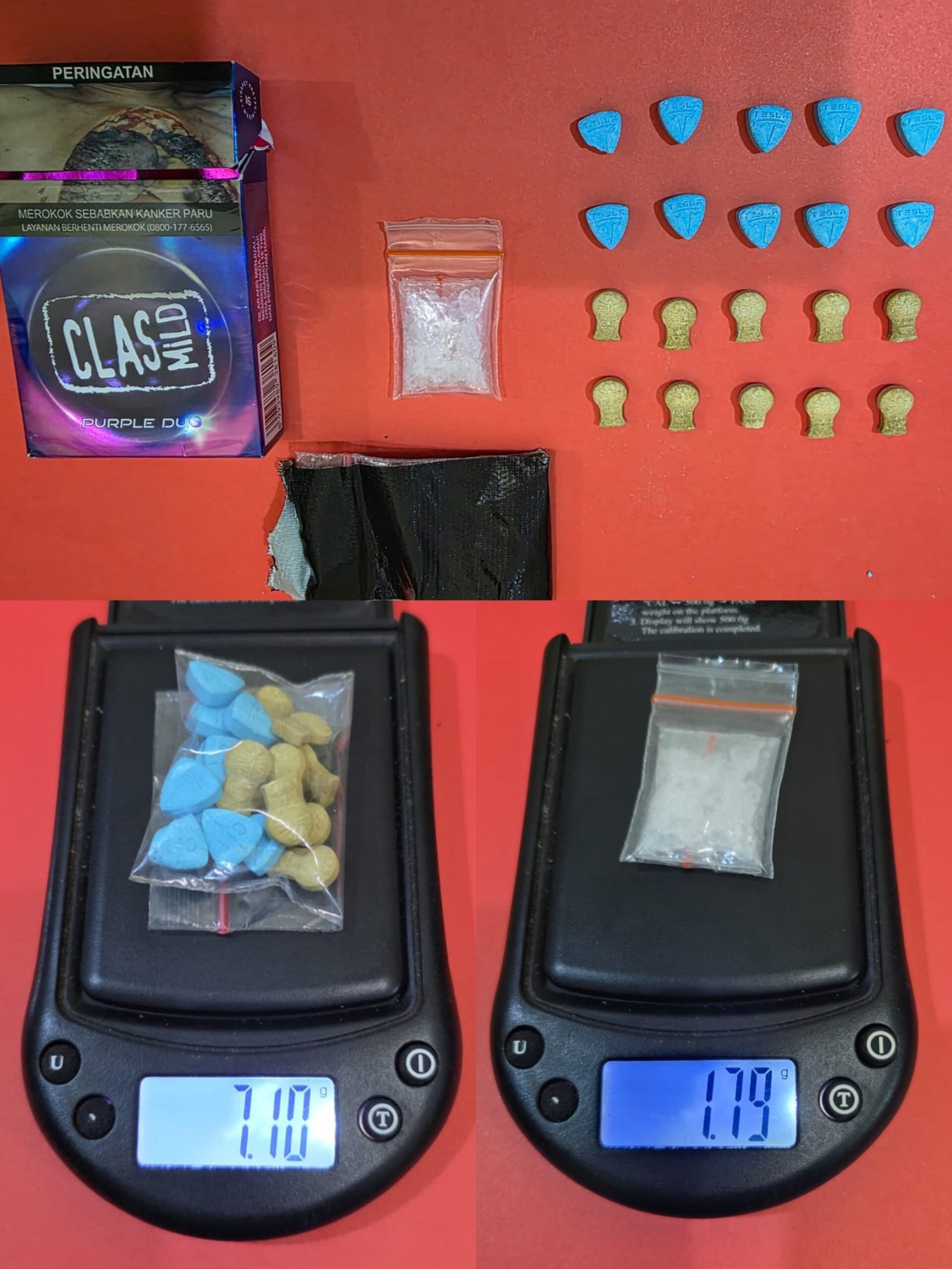 Dari hasil penangkapan, petugas mengamankan barang bukti berupa, 10 butir ekstasi warna kuning berlogo Doraemon (3,78 gram),10 butir ekstasi warna biru berlogo Tesla (3,64 gram), 1 paket sabu seberat 1,79 gram, 1 kotak rokok merek Classmild berlakban hitam