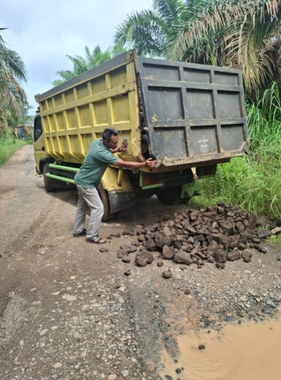 “Hari ini kita lakukan dua kali pengangkutan batu menggunakan mobil dump truk untuk menimbun jalan yang rusak. Jalan ini banyak dilalui masyarakat, jadi harus segera dibantu agar aman,” jelasnya.