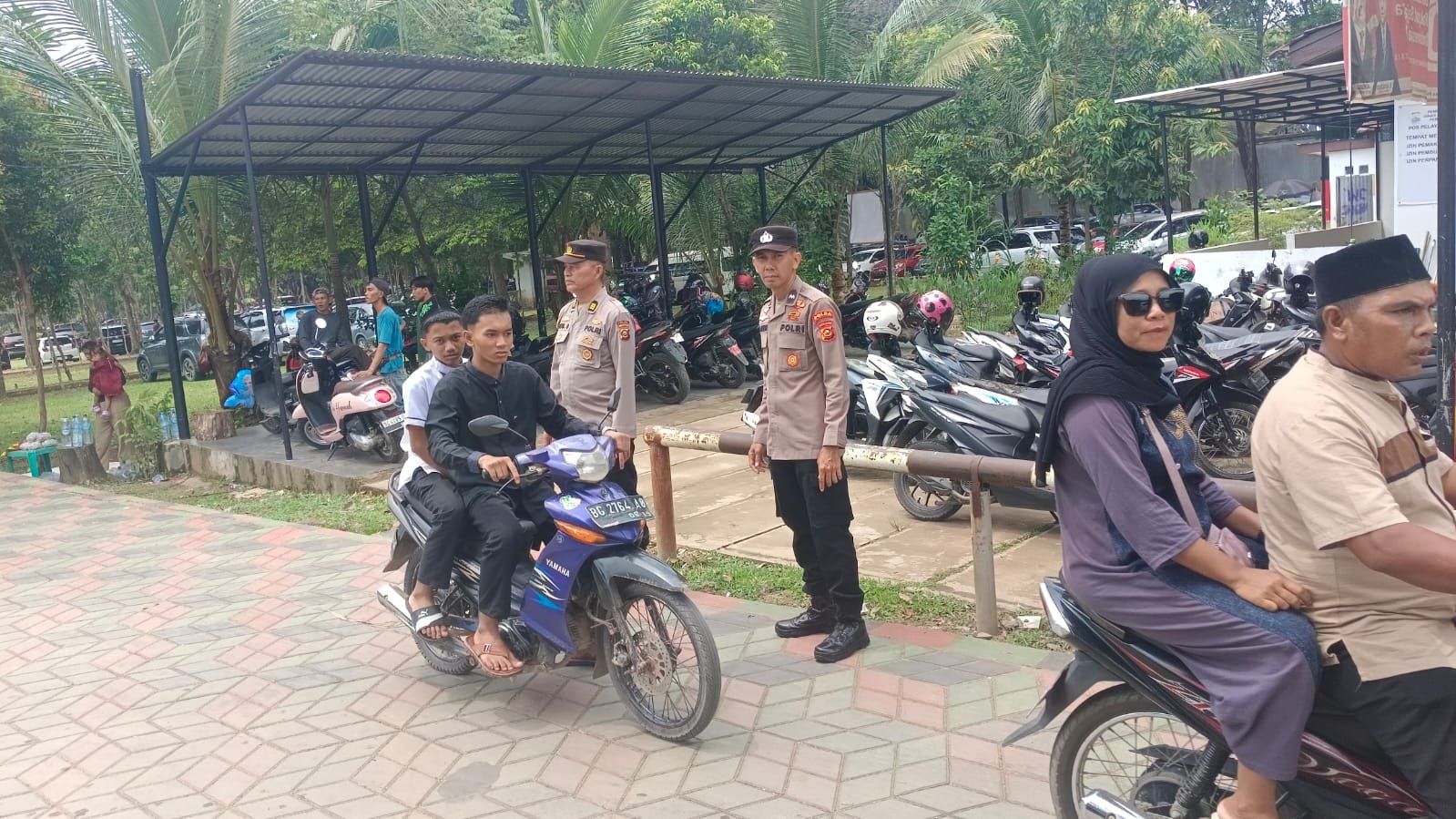 Selain pengamanan ibadah, petugas juga melakukan pengaturan lalu lintas serta pengawasan area parkir untuk mengantisipasi tindak kriminalitas seperti pencurian kendaraan.