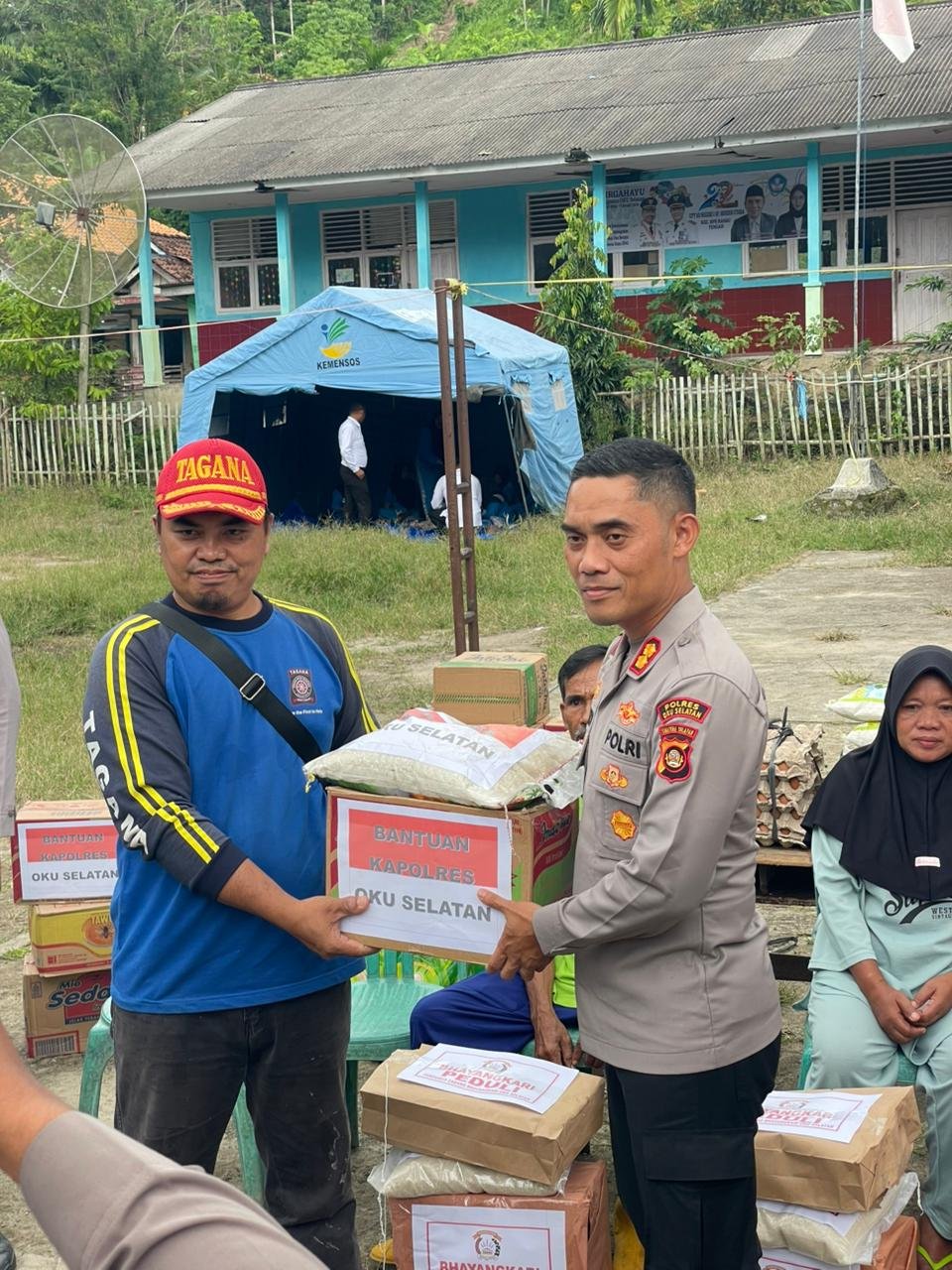 Kapolres OKU Selatan, I Made Redi Hartana, memimpin langsung kegiatan penyaluran bantuan yang dilaksanakan, Senin (30/3/2026) di Posko Dapur Umum Dinas Sosial Dusun Manduriang.