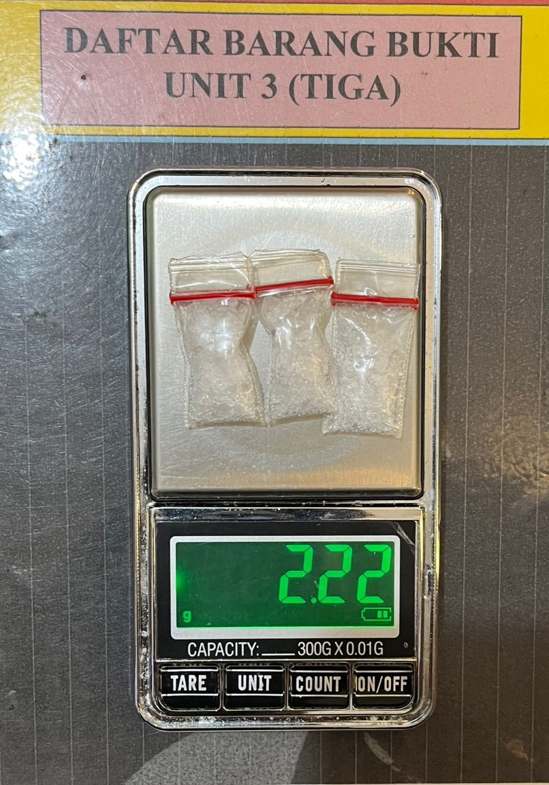 Barang bukti yang diamankan meliputi tiga bungkus plastik klip bening berisi narkotika jenis shabu dengan berat bruto 2,22 gram, satu buah pipet plastik runcing, satu unit timbangan digital warna silver, serta satu kotak rokok yang digunakan sebagai tempat penyimpanan. Tersangka mengakui bahwa barang tersebut merupakan miliknya yang akan diedarkan kembali.