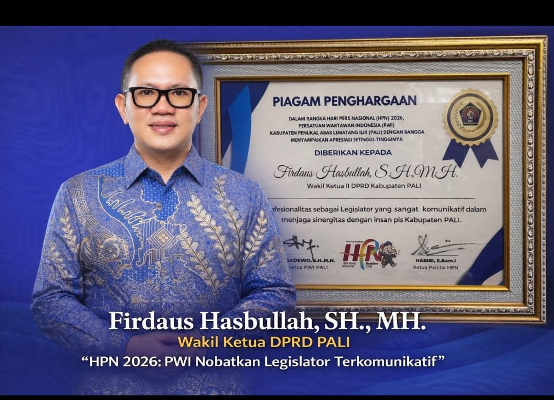 Lubuklinggau, Sumselnetwork.com– Persatuan Wartawan Indonesia (PWI) Kabupaten Penukal Abab Lematang Ilir (PALI) menobatkan Wakil Ketua DPRD PALI, Firdaus Hasbullah, SH, MH, sebagai “Legislator Paling Komunikatif”. Penghargaan tersebut diberikan dalam rangka peringatan Hari Pers Nasional (HPN) Tahun 2026.