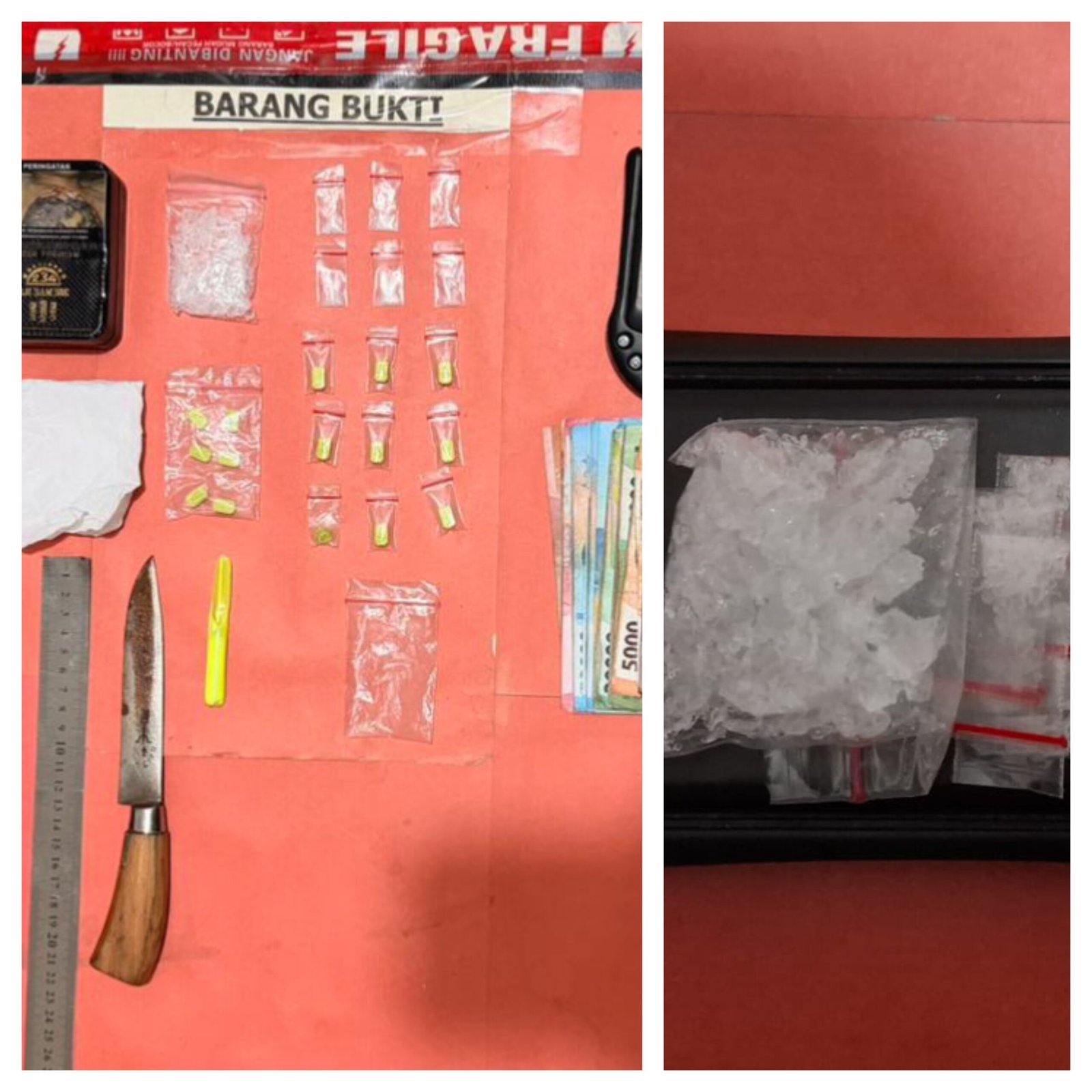 Barang bukti yang berhasil diamankan meliputi,7 paket diduga sabu dengan berat bruto 8,97 gram,14 butir dan pecahan diduga ekstasi seberat 7,25 gram,1 unit timbangan digital, 2 ball plastik klip bening,1 buku catatan transaksi narkotika,1 bilah senjata tajam jenis pisau, Uang tunai Rp1.300.000,- hasil transaksi.