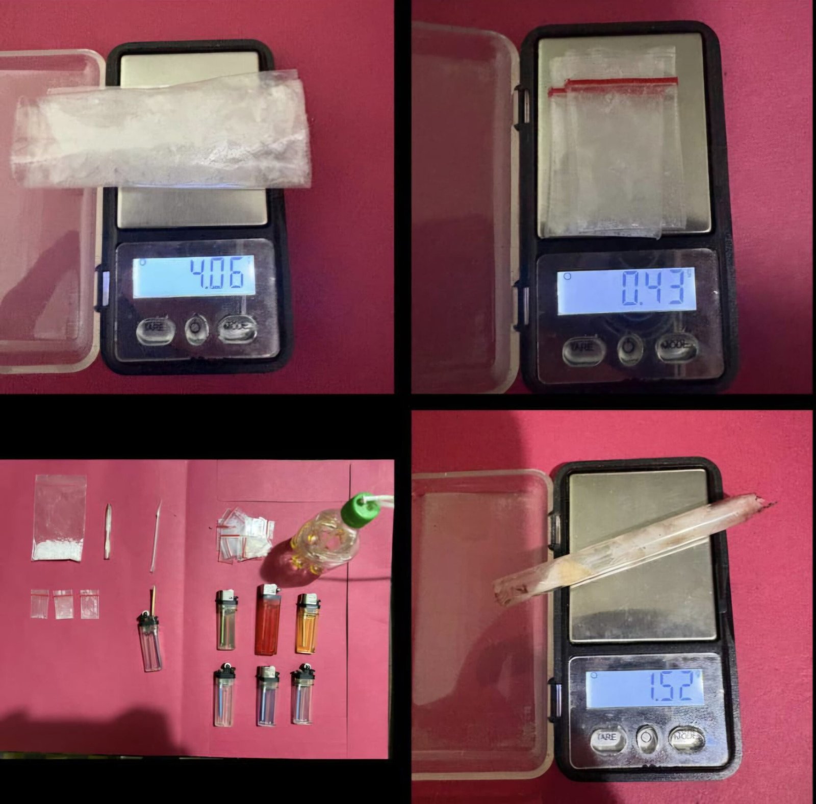 Adapun barang bukti yang berhasil diamankan berupa satu bungkus plastik klip berisi kristal putih diduga sabu dengan berat bruto 4,05 gram, tiga bungkus plastik klip berisi kristal putih diduga sabu dengan berat bruto 0,43 gram, satu buah pirek kaca berisi sabu dengan berat bruto 1,52 gram, tujuh buah korek api, Satu buah alat hisap sabu (bong), Satu buah alat sekop sabu jenis pipet.