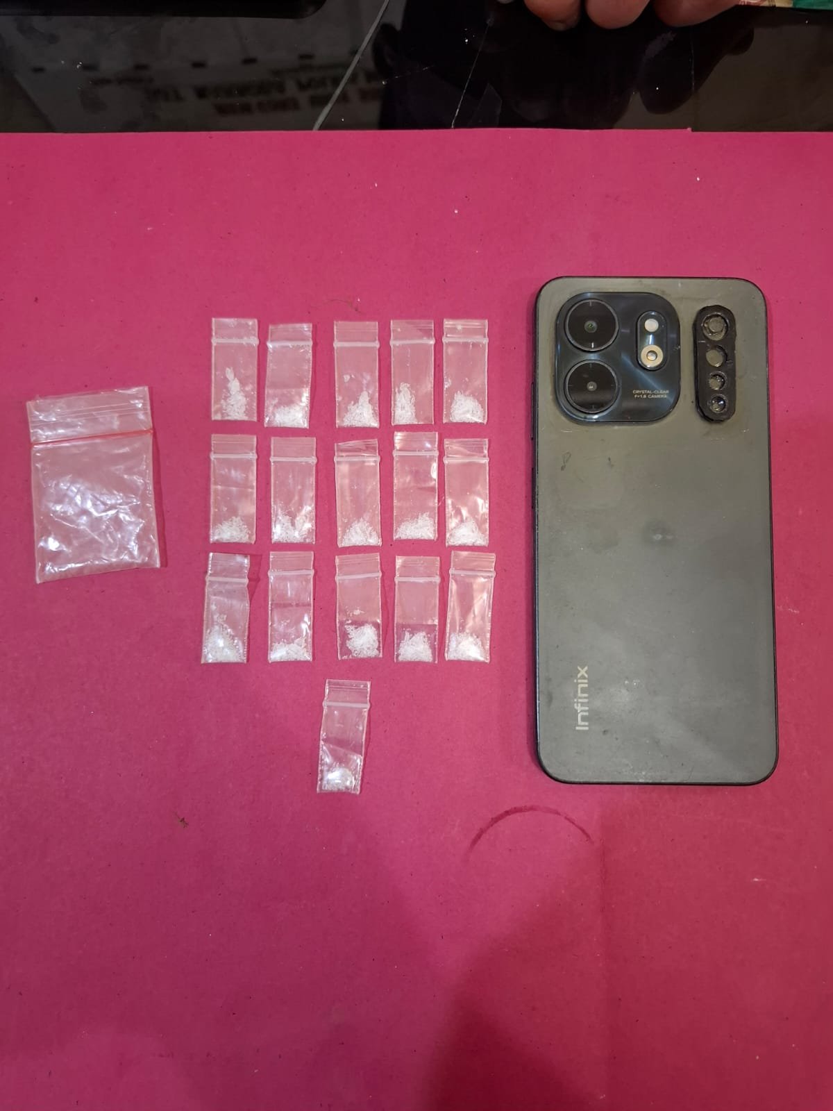 Selain itu, petugas turut mengamankan barang bukti pendukung berupa plastik klip kosong ukuran sedang serta satu unit telepon genggam merek Infinix yang diduga digunakan sebagai sarana komunikasi transaksi.
